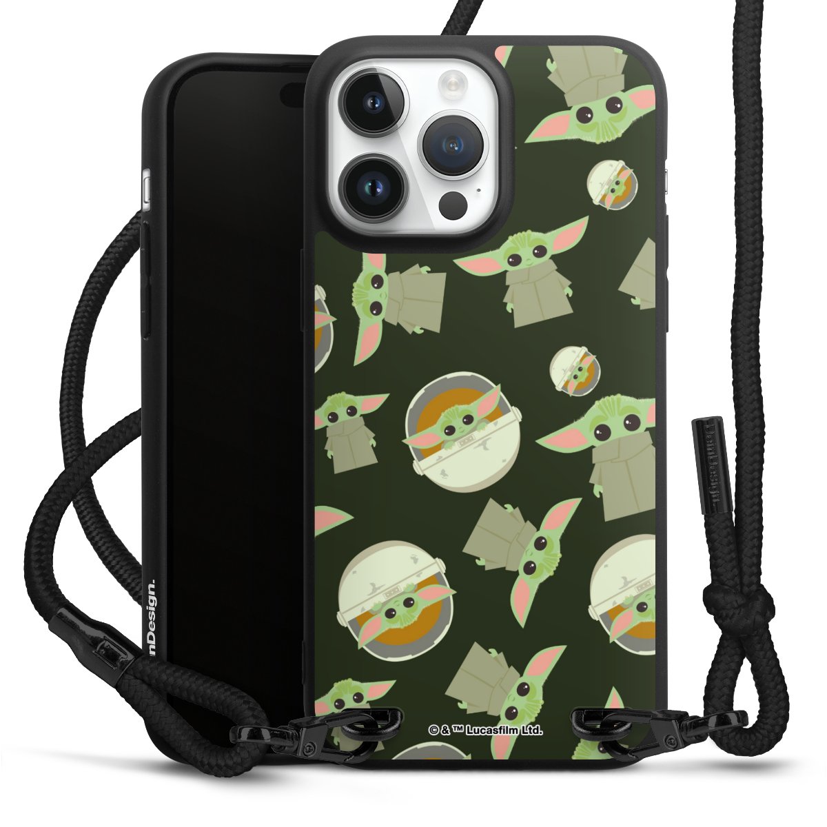 Pure Black: Handyhülle, Stoffband und Metalldetails in stylischem Mattschwarz.
