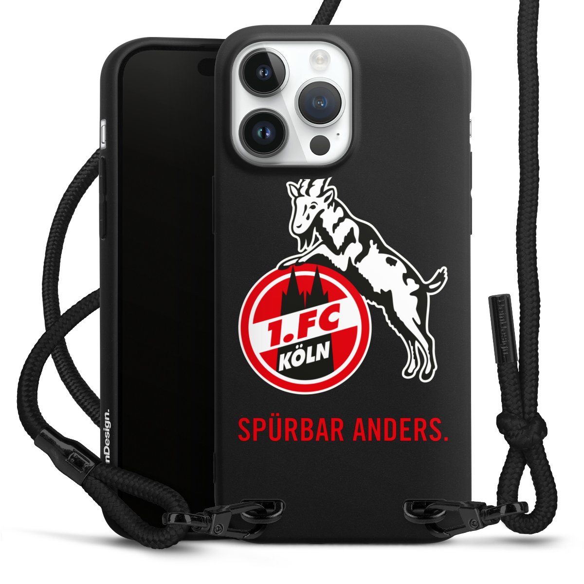 Pure Black: Handyhülle, Stoffband und Metalldetails in stylischem Mattschwarz.