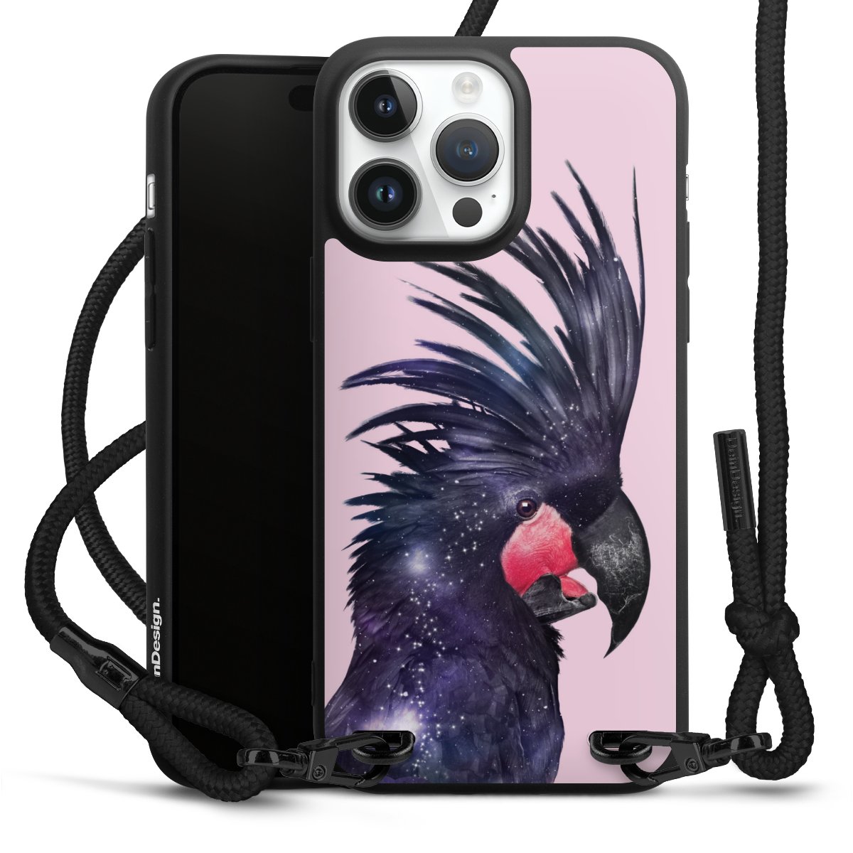 Pure Black: Handyhülle, Stoffband und Metalldetails in stylischem Mattschwarz.