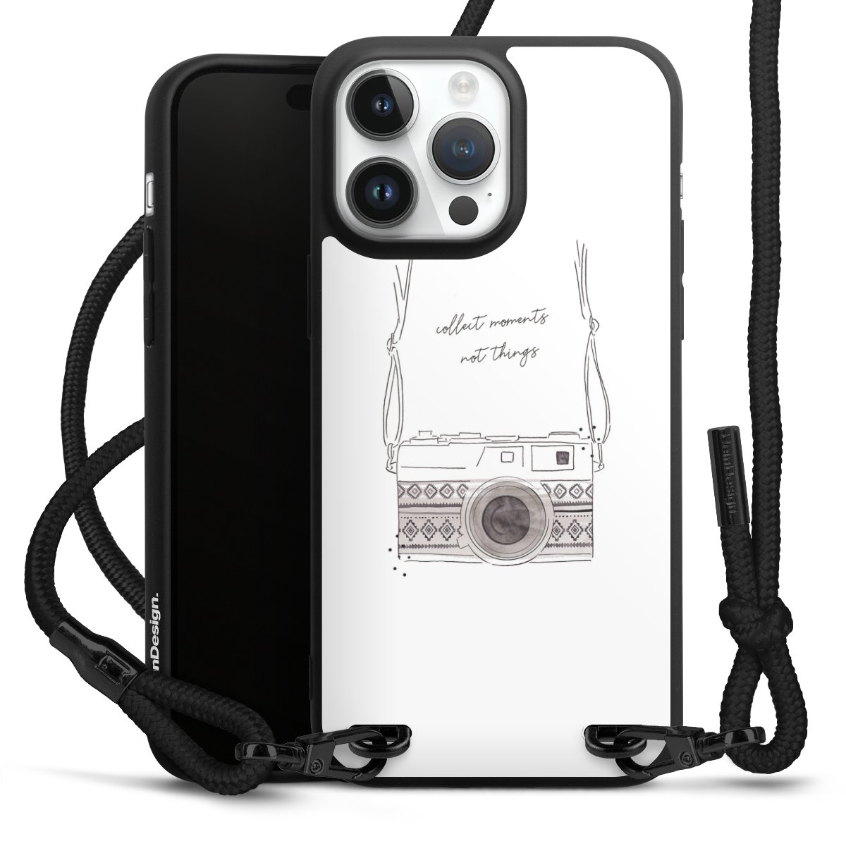 Pure Black: Handyhülle, Stoffband und Metalldetails in stylischem Mattschwarz.