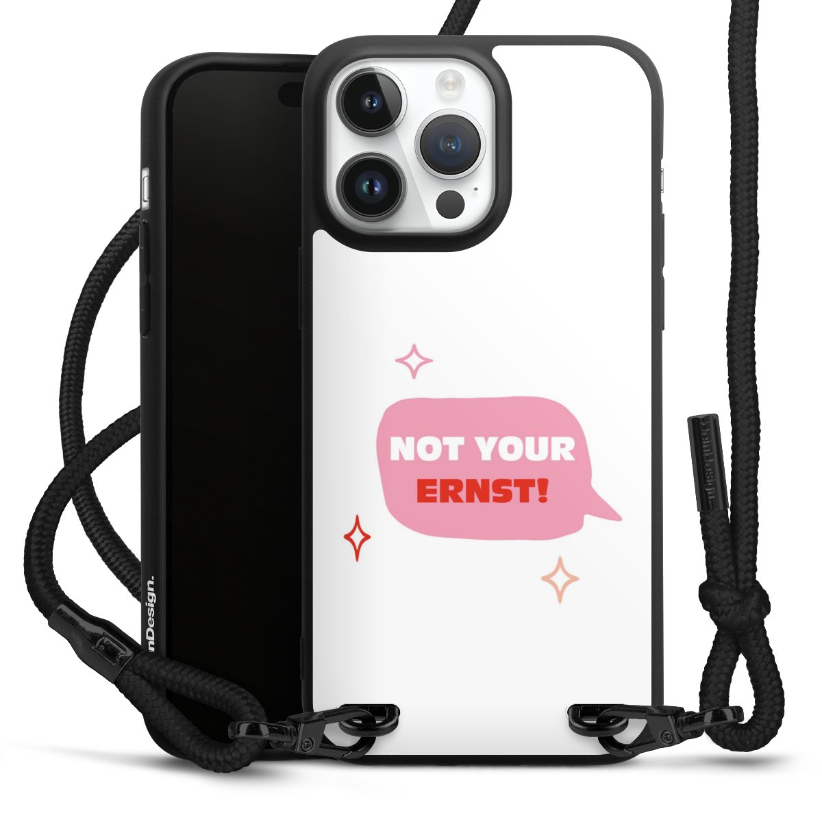 Pure Black: Handyhülle, Stoffband und Metalldetails in stylischem Mattschwarz.