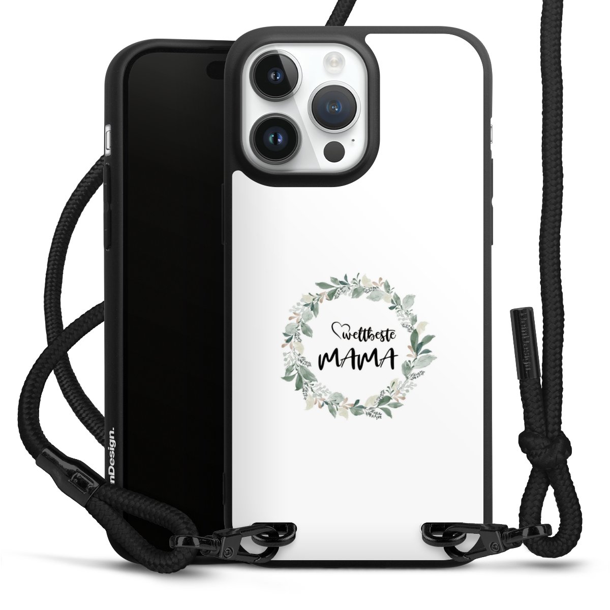 Pure Black: Handyhülle, Stoffband und Metalldetails in stylischem Mattschwarz.