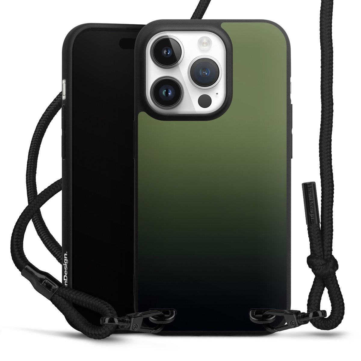 Pure Black: Handyhülle, Stoffband und Metalldetails in stylischem Mattschwarz.
