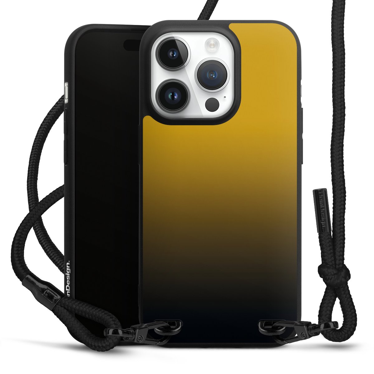Pure Black: Handyhülle, Stoffband und Metalldetails in stylischem Mattschwarz.