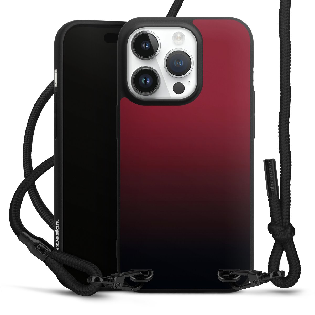 Pure Black: Handyhülle, Stoffband und Metalldetails in stylischem Mattschwarz.