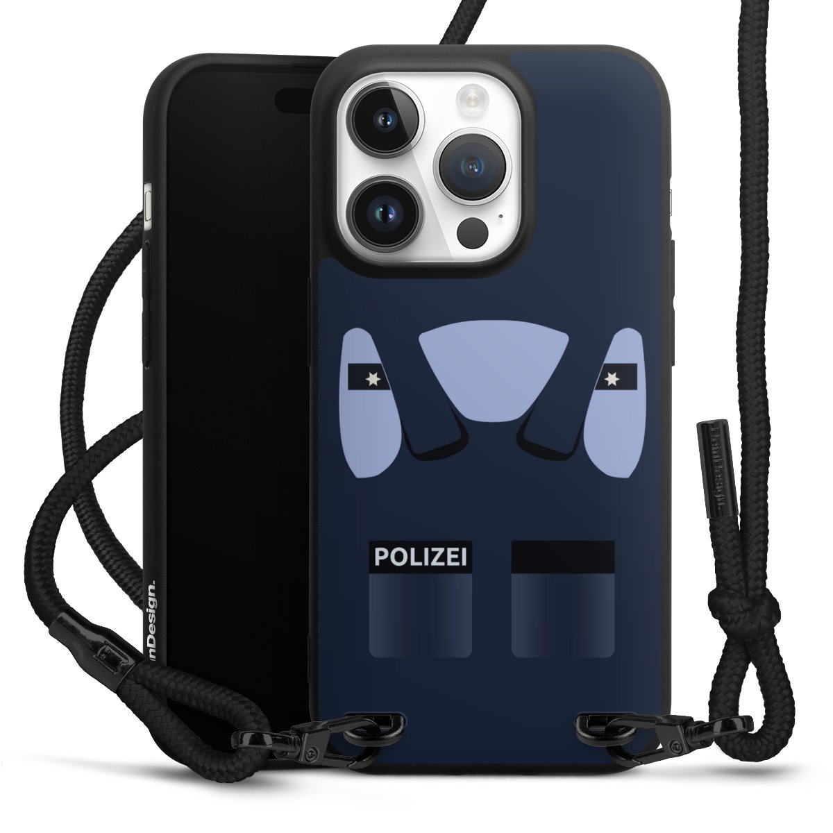 Pure Black: Handyhülle, Stoffband und Metalldetails in stylischem Mattschwarz.