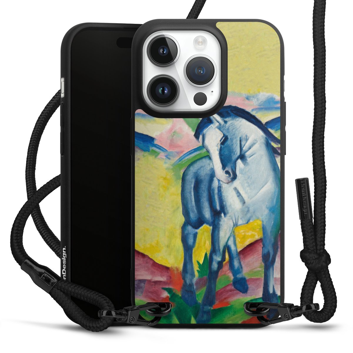 Pure Black: Handyhülle, Stoffband und Metalldetails in stylischem Mattschwarz.