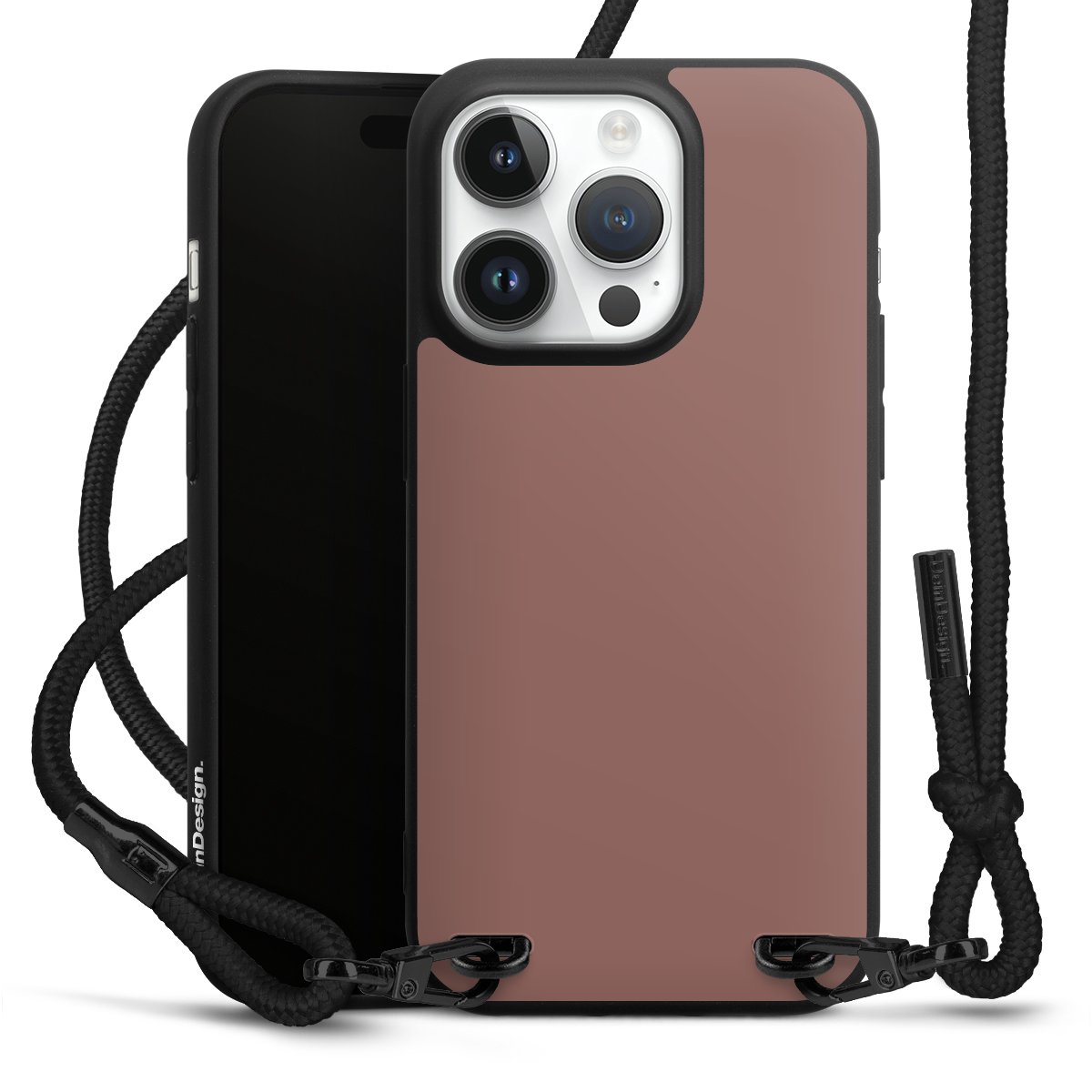 Pure Black: Handyhülle, Stoffband und Metalldetails in stylischem Mattschwarz.