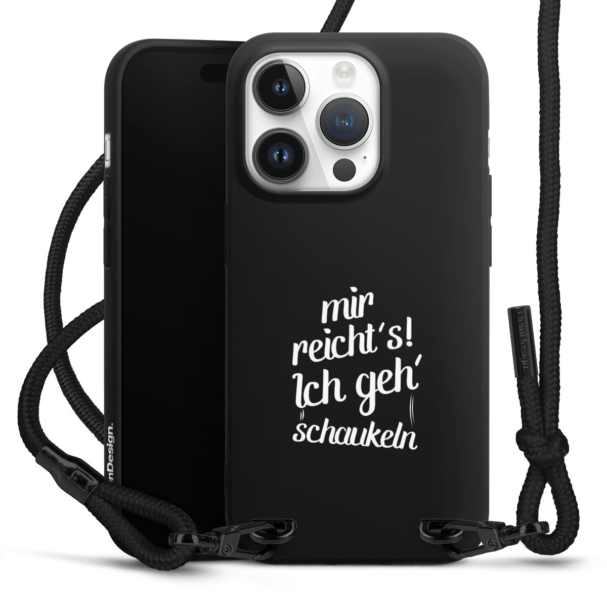 Pure Black: Handyhülle, Stoffband und Metalldetails in stylischem Mattschwarz.