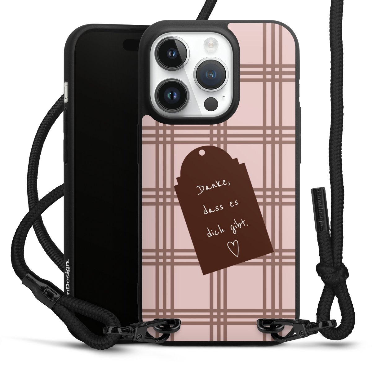 Pure Black: Handyhülle, Stoffband und Metalldetails in stylischem Mattschwarz.