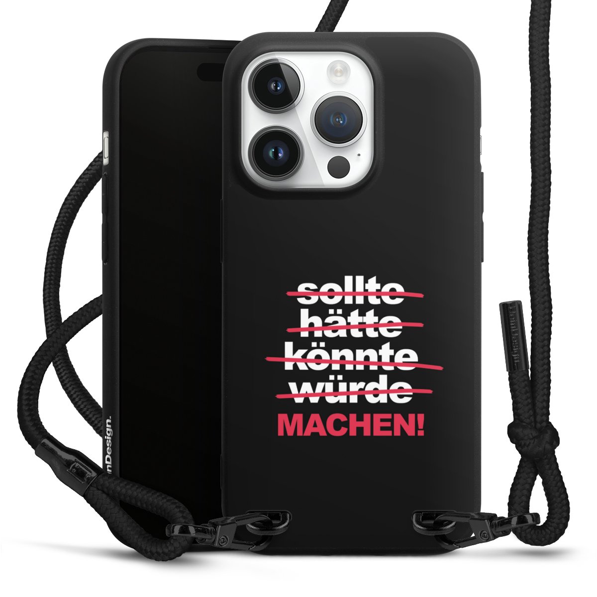 Pure Black: Handyhülle, Stoffband und Metalldetails in stylischem Mattschwarz.