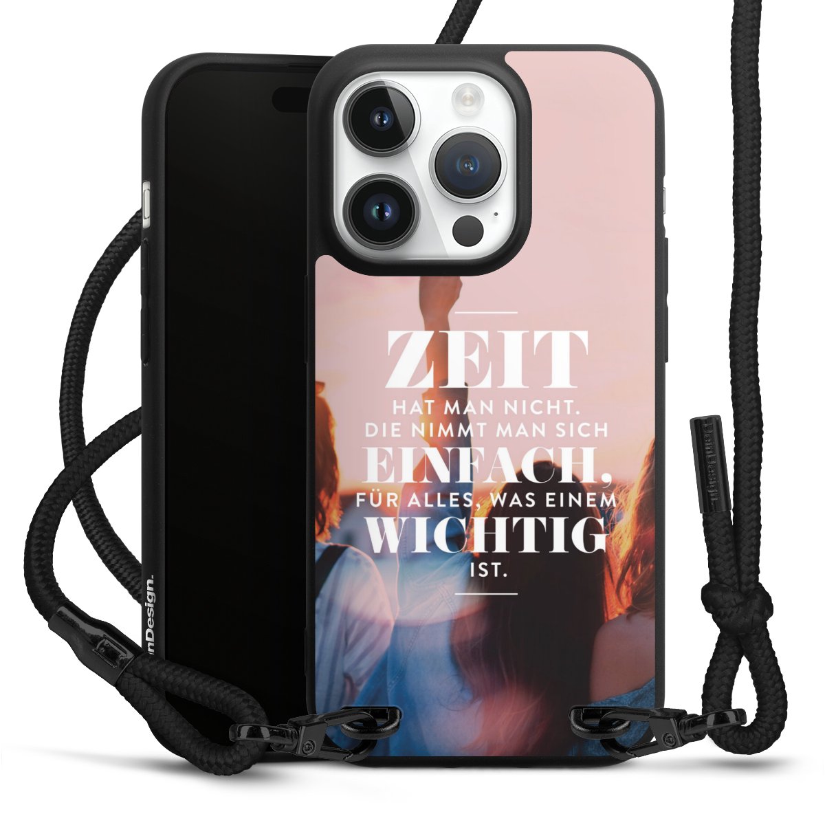 Pure Black: Handyhülle, Stoffband und Metalldetails in stylischem Mattschwarz.