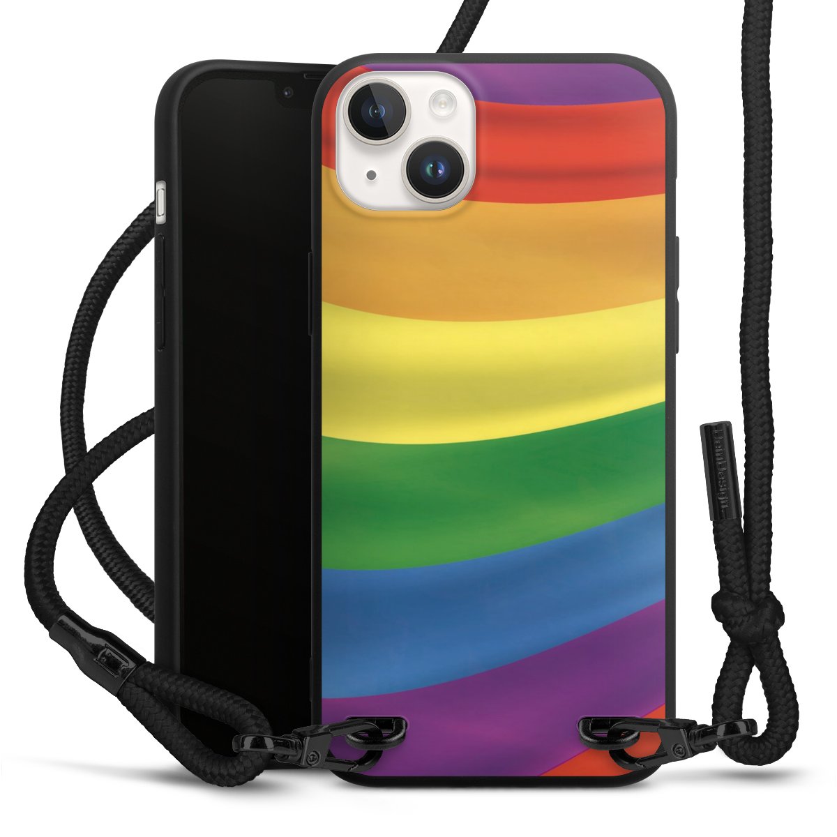Pure Black: Handyhülle, Stoffband und Metalldetails in stylischem Mattschwarz.