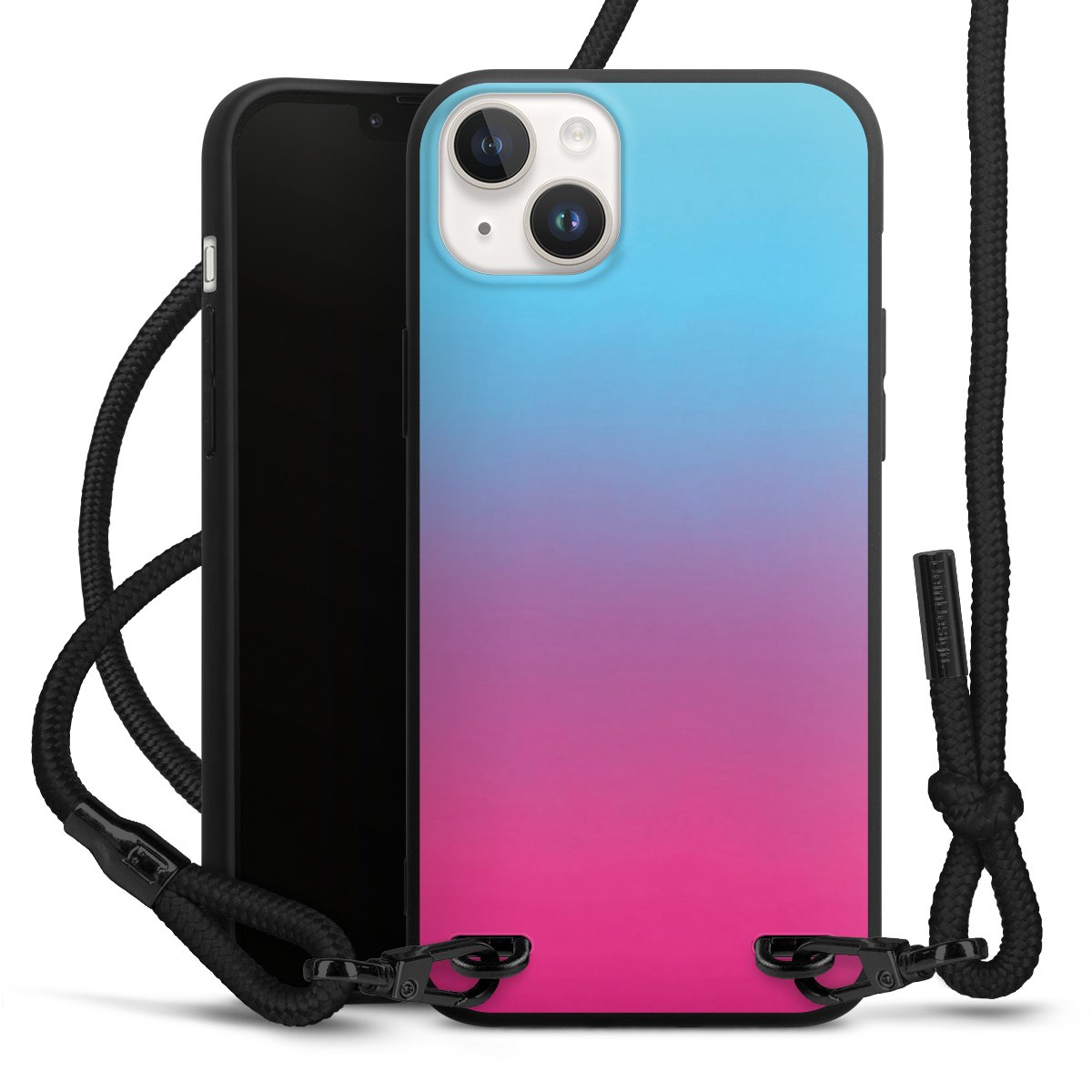 Pure Black: Handyhülle, Stoffband und Metalldetails in stylischem Mattschwarz.