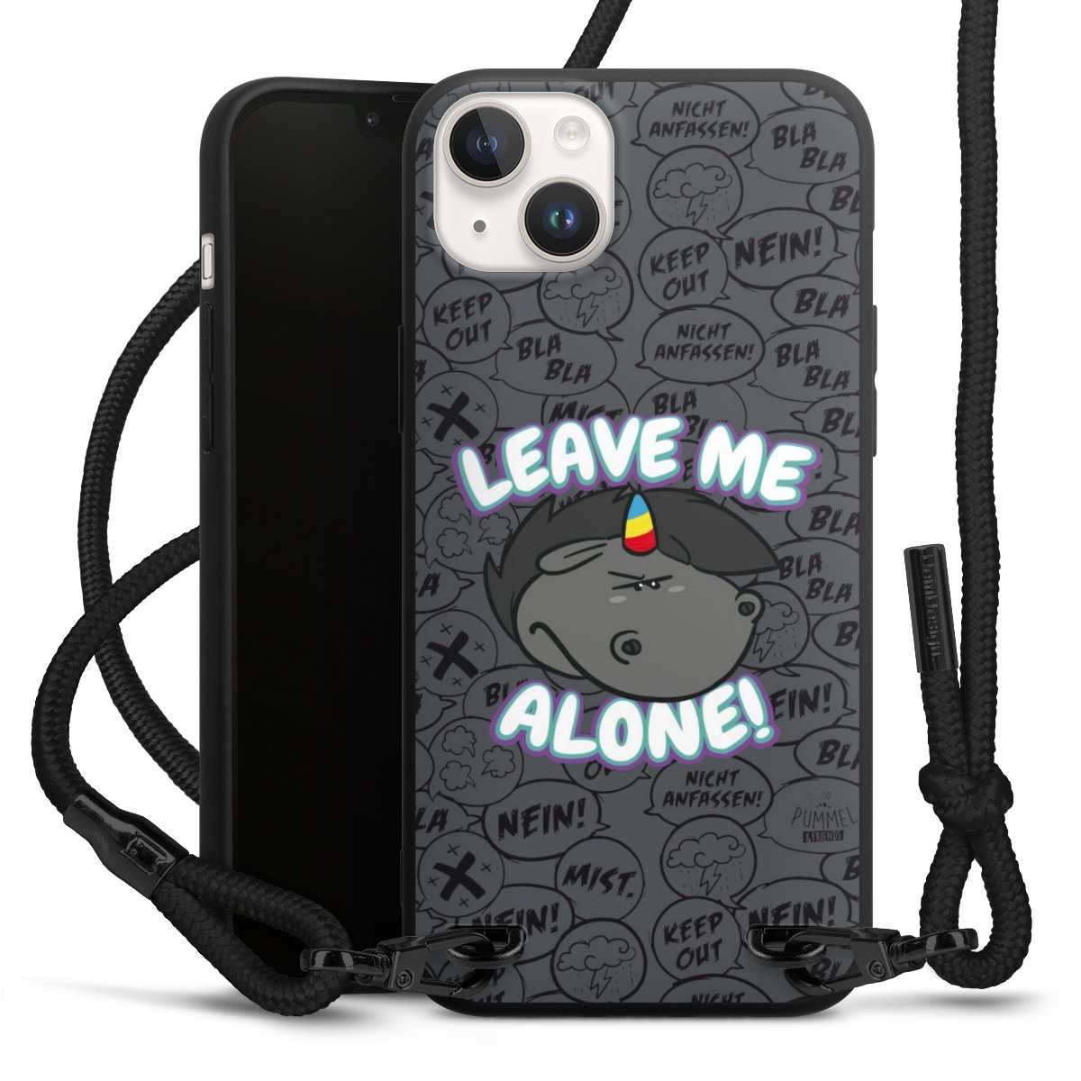 Pure Black: Handyhülle, Stoffband und Metalldetails in stylischem Mattschwarz.
