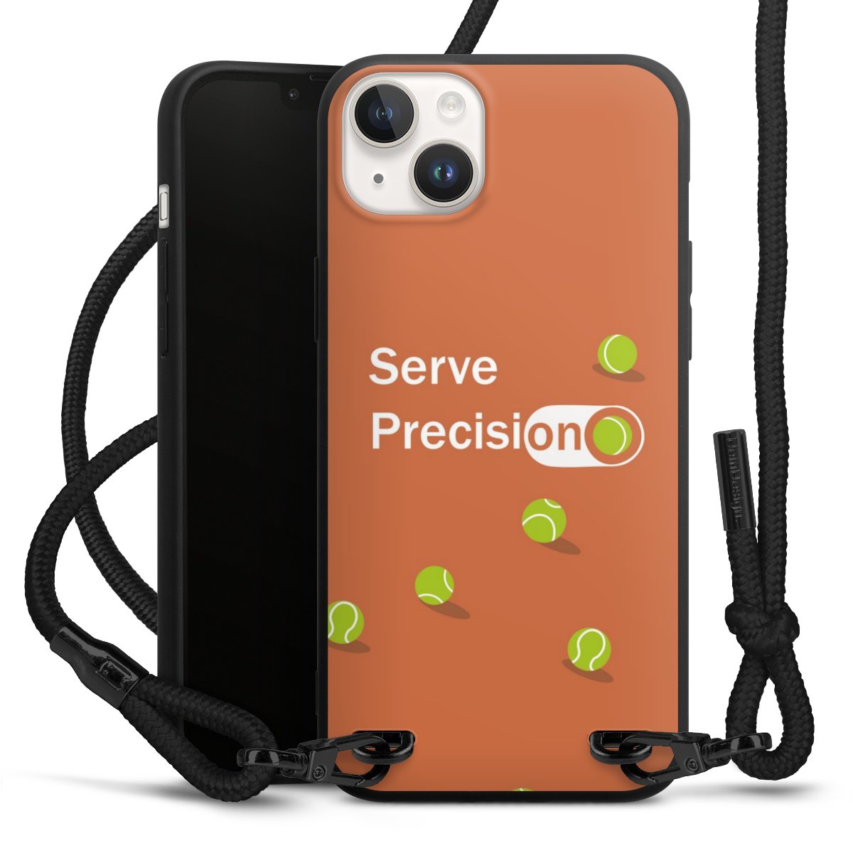 Pure Black: Handyhülle, Stoffband und Metalldetails in stylischem Mattschwarz.