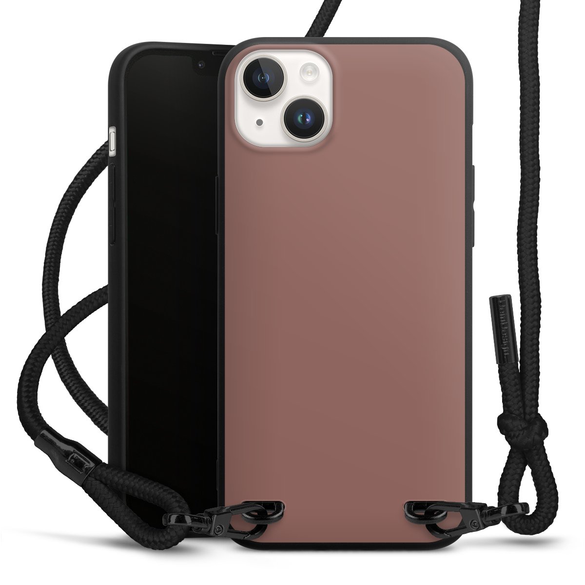 Pure Black: Handyhülle, Stoffband und Metalldetails in stylischem Mattschwarz.