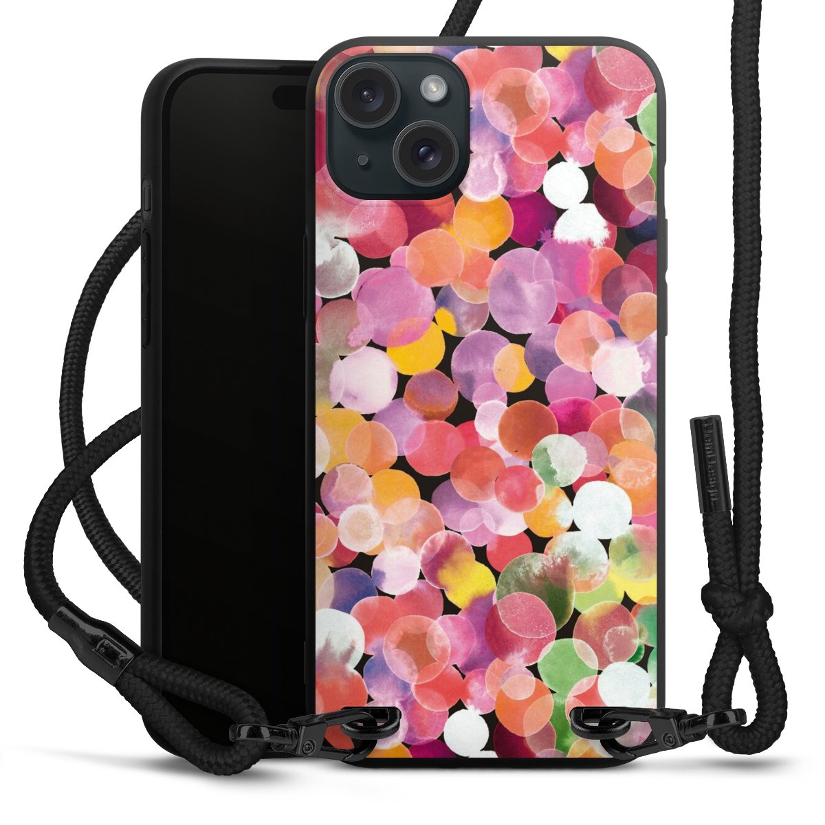 Pure Black: Handyhülle, Stoffband und Metalldetails in stylischem Mattschwarz.