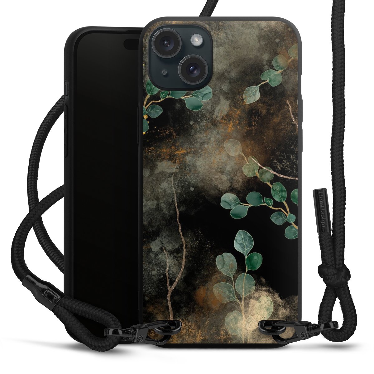 Pure Black: Handyhülle, Stoffband und Metalldetails in stylischem Mattschwarz.