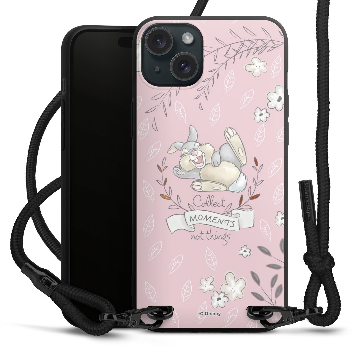 Pure Black: Handyhülle, Stoffband und Metalldetails in stylischem Mattschwarz.