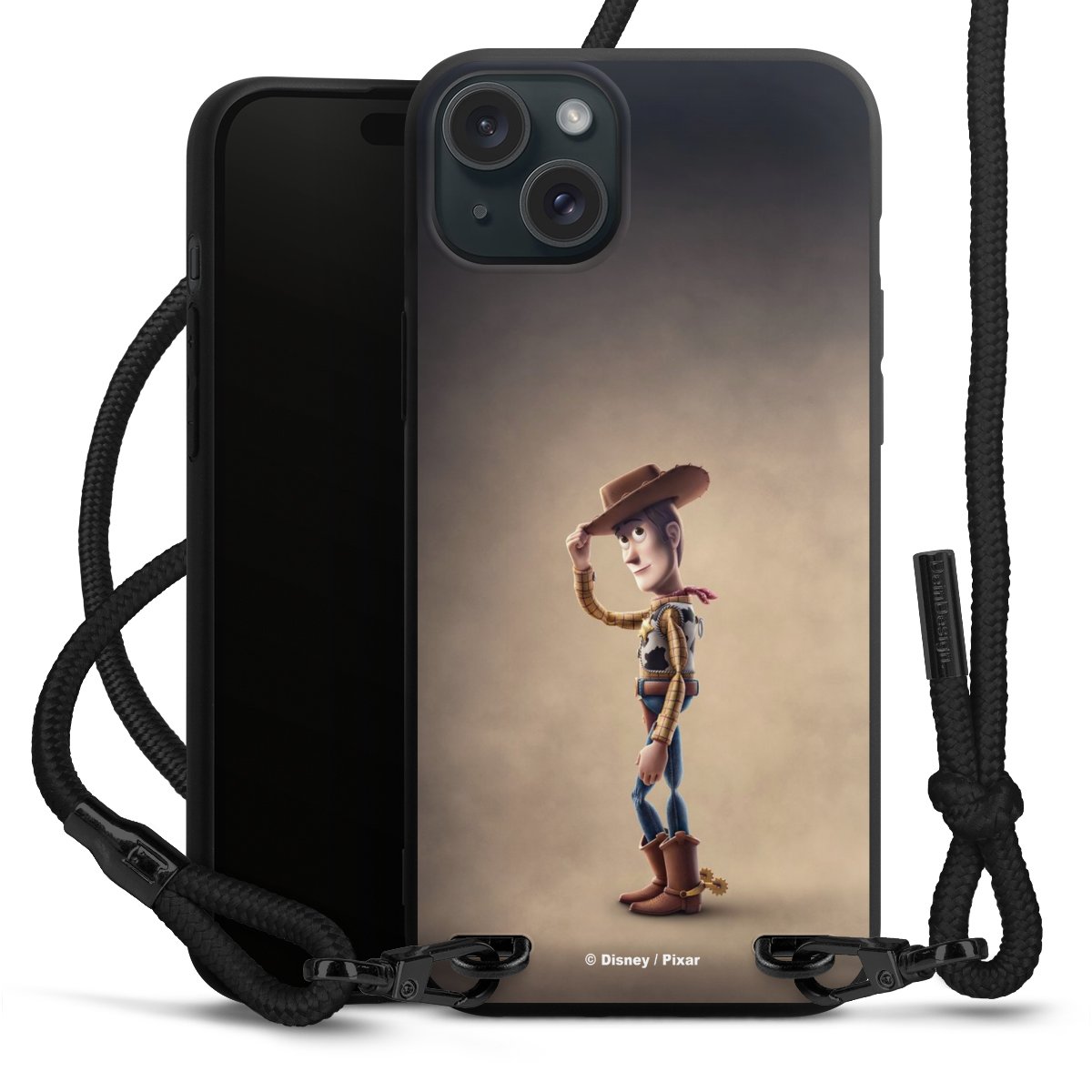 Pure Black: Handyhülle, Stoffband und Metalldetails in stylischem Mattschwarz.
