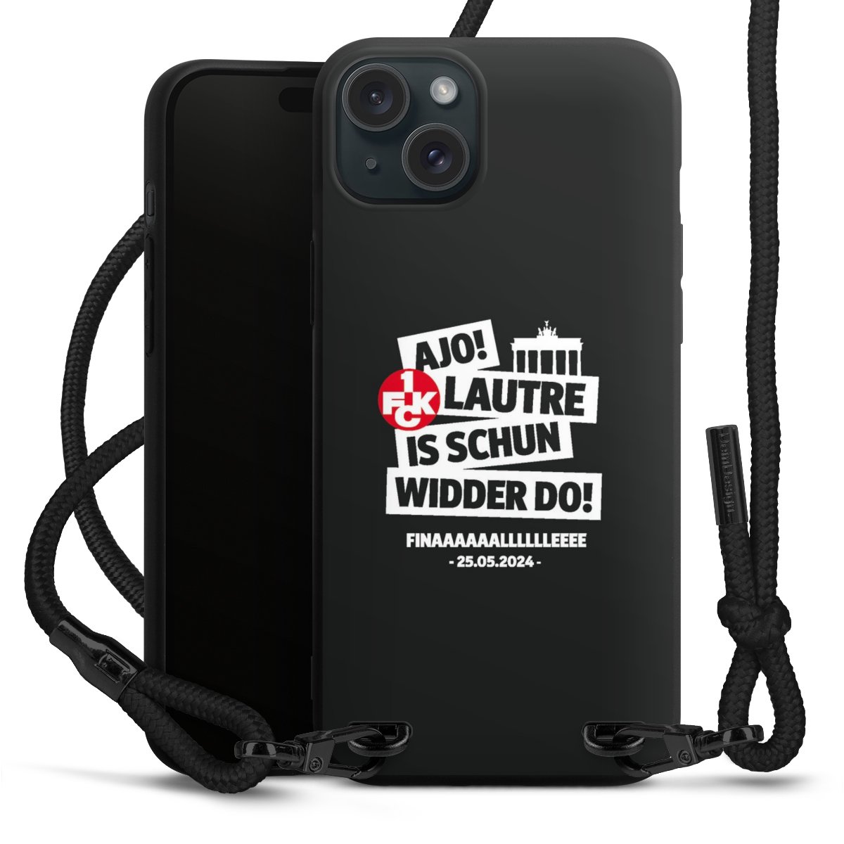 Pure Black: Handyhülle, Stoffband und Metalldetails in stylischem Mattschwarz.