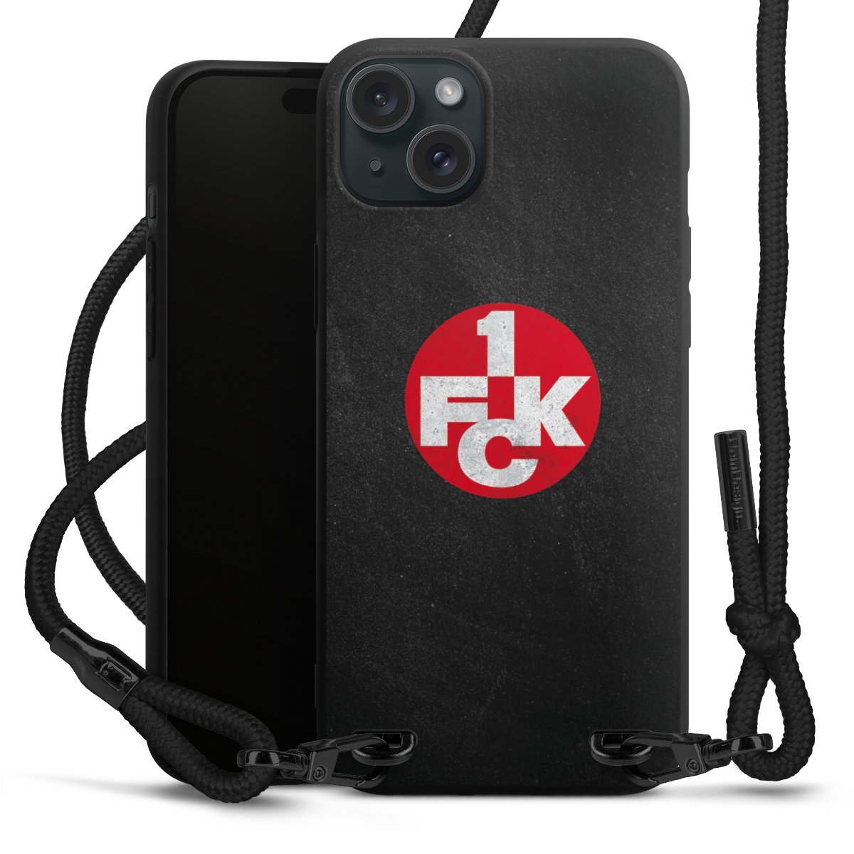 Pure Black: Handyhülle, Stoffband und Metalldetails in stylischem Mattschwarz.