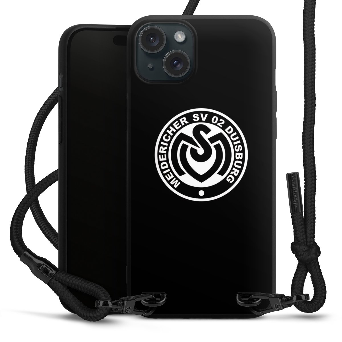 Pure Black: Handyhülle, Stoffband und Metalldetails in stylischem Mattschwarz.