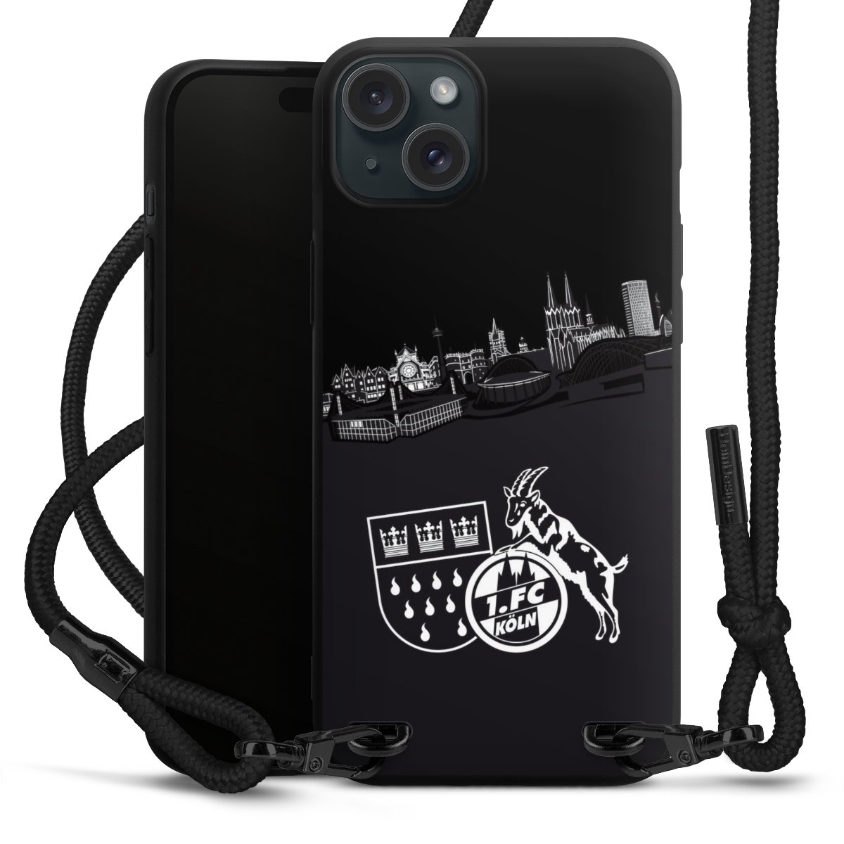 Pure Black: Handyhülle, Stoffband und Metalldetails in stylischem Mattschwarz.