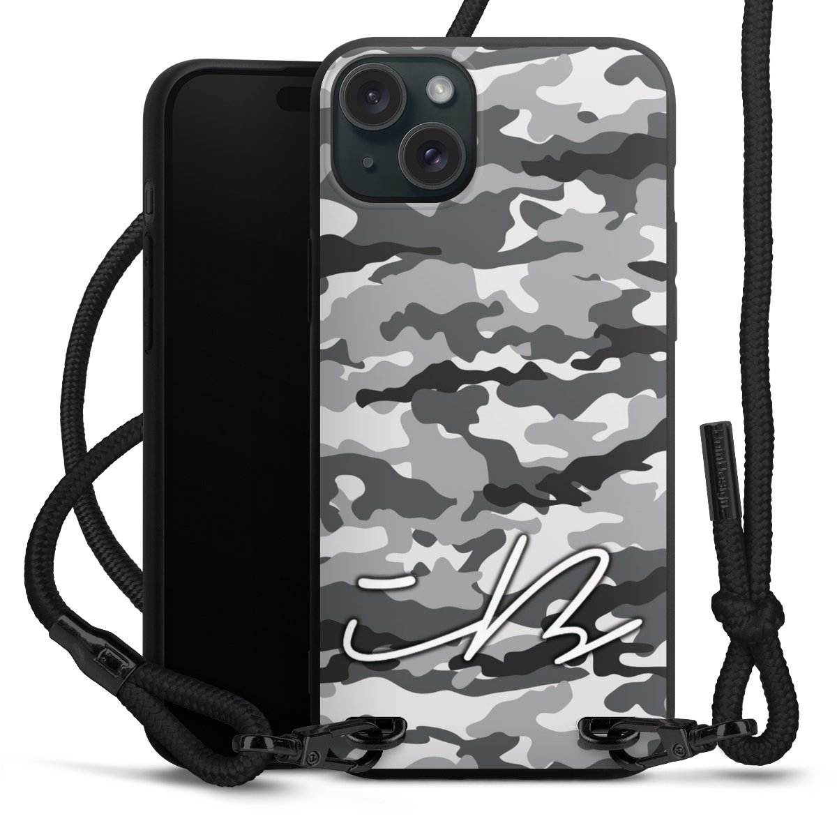 Pure Black: Handyhülle, Stoffband und Metalldetails in stylischem Mattschwarz.