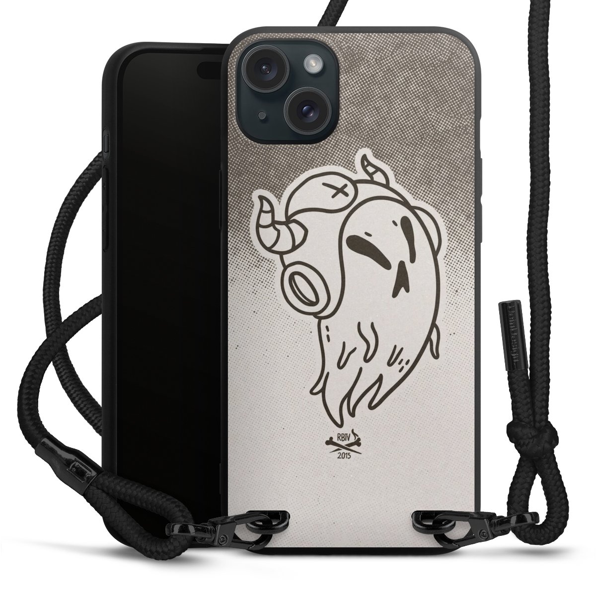 Pure Black: Handyhülle, Stoffband und Metalldetails in stylischem Mattschwarz.