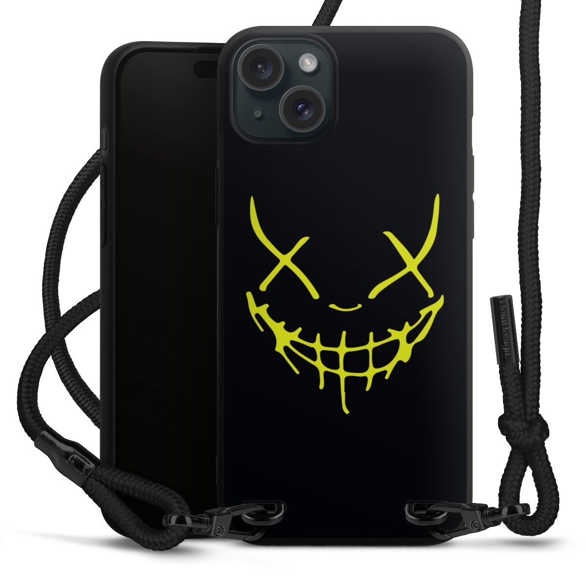 Pure Black: Handyhülle, Stoffband und Metalldetails in stylischem Mattschwarz.