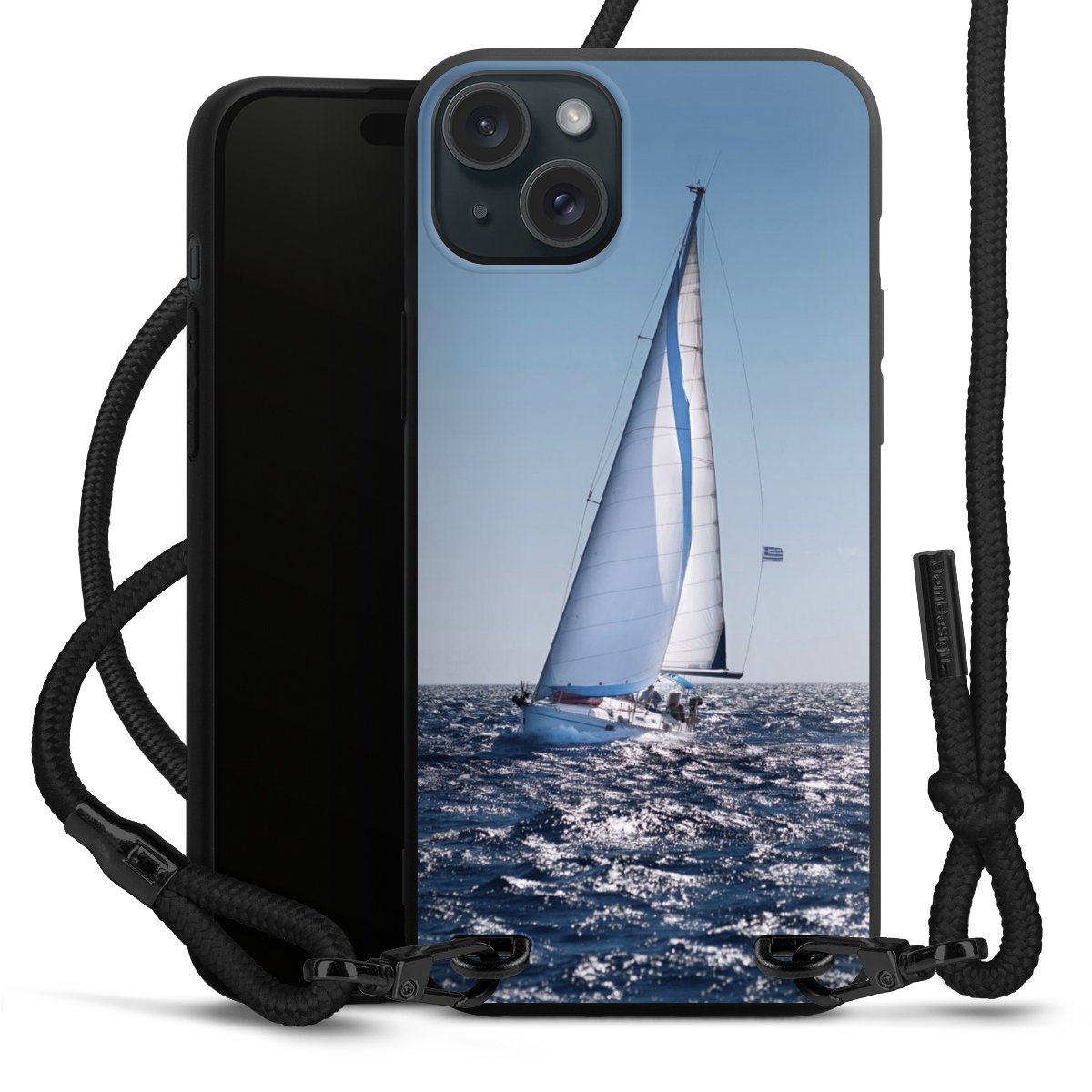 Pure Black: Handyhülle, Stoffband und Metalldetails in stylischem Mattschwarz.