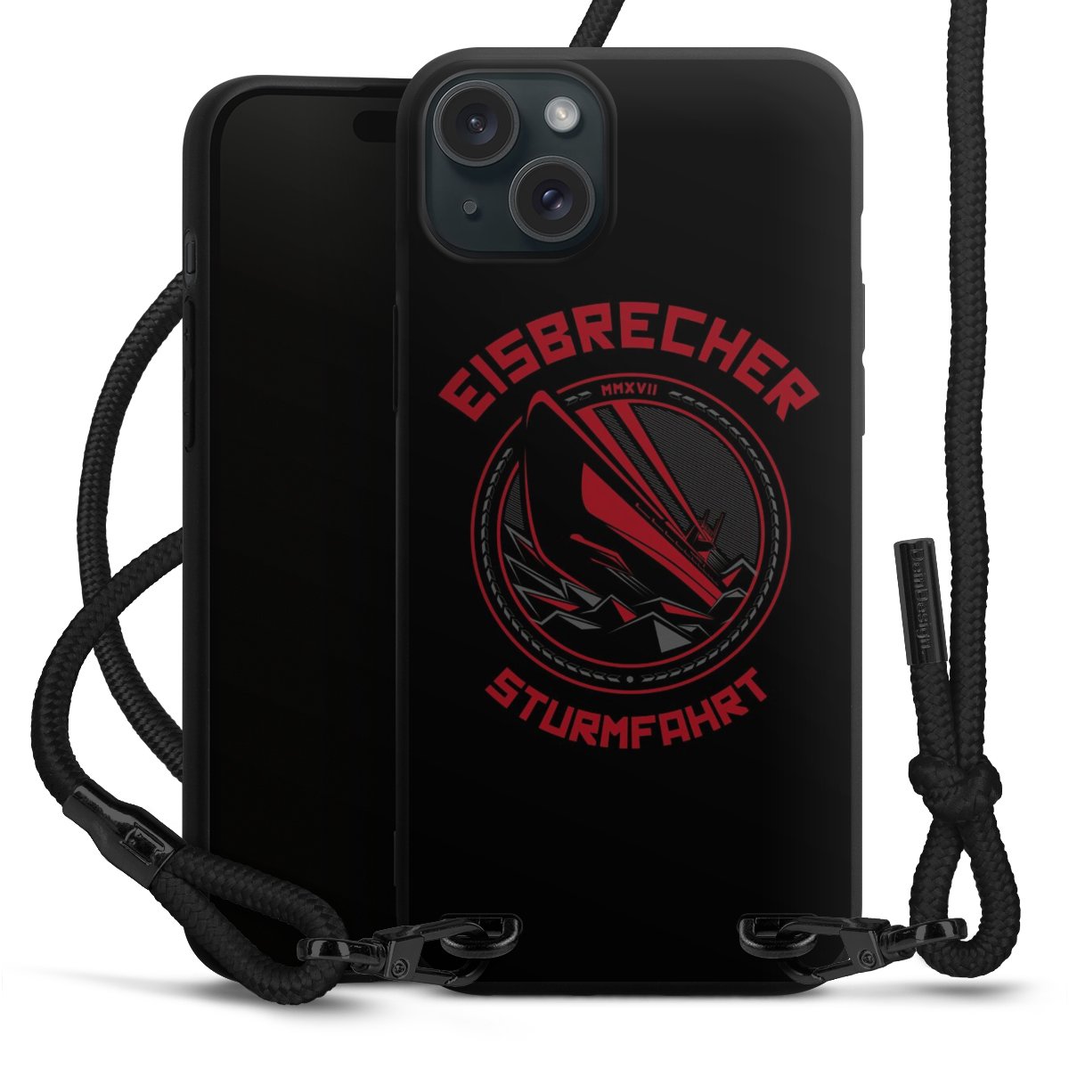 Pure Black: Handyhülle, Stoffband und Metalldetails in stylischem Mattschwarz.