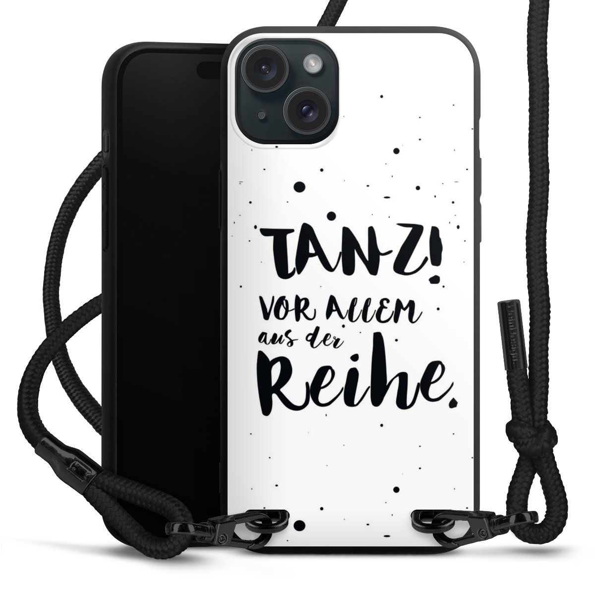 Pure Black: Handyhülle, Stoffband und Metalldetails in stylischem Mattschwarz.
