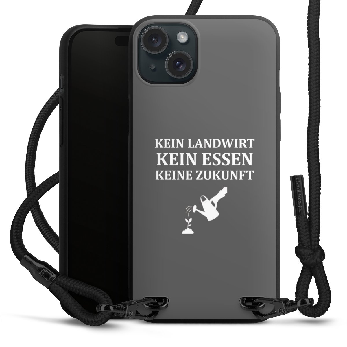 Pure Black: Handyhülle, Stoffband und Metalldetails in stylischem Mattschwarz.