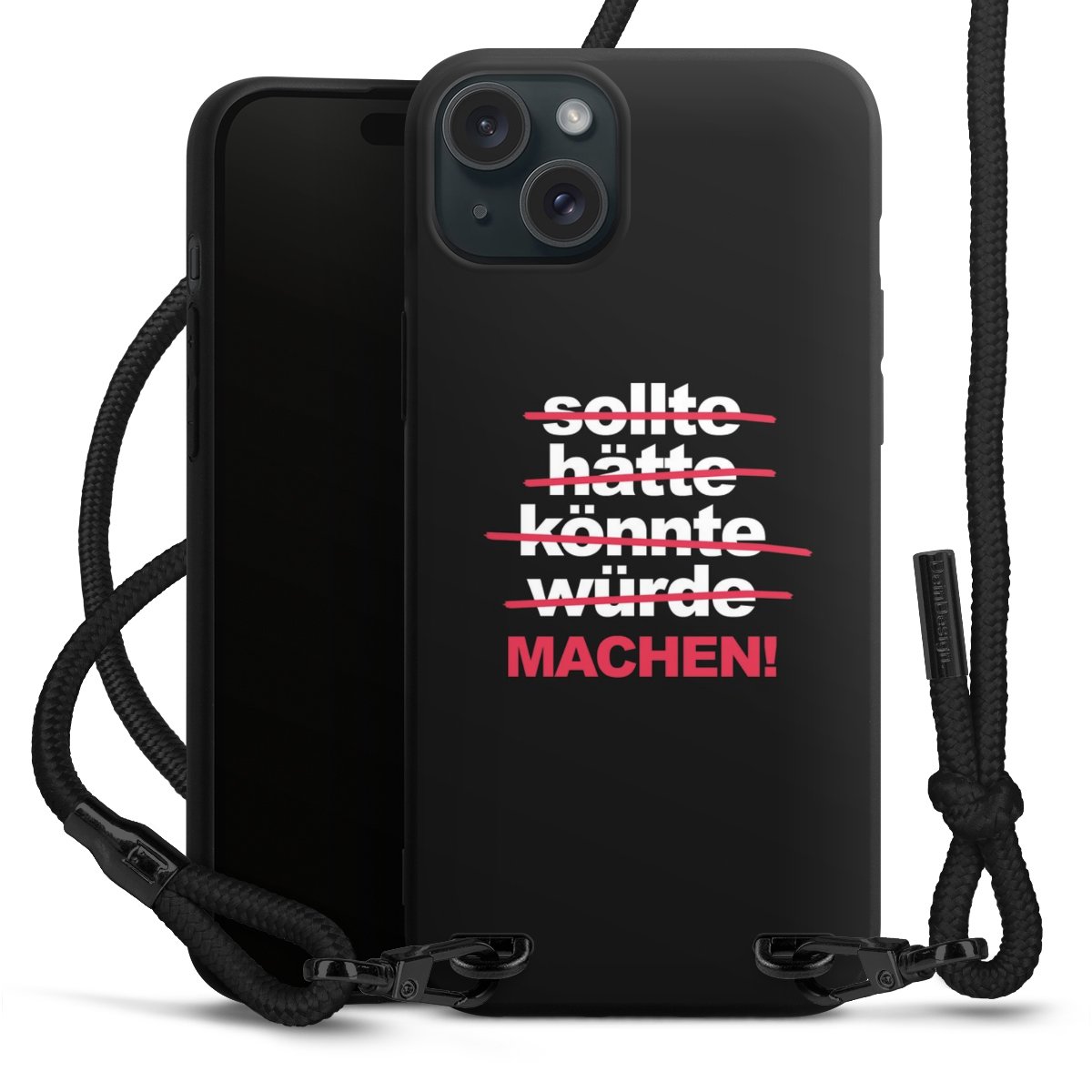 Pure Black: Handyhülle, Stoffband und Metalldetails in stylischem Mattschwarz.