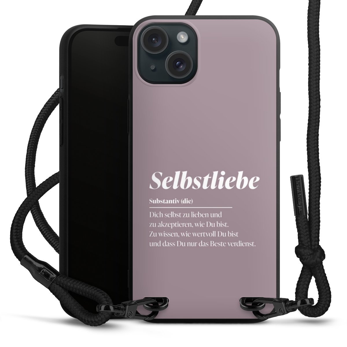 Pure Black: Handyhülle, Stoffband und Metalldetails in stylischem Mattschwarz.