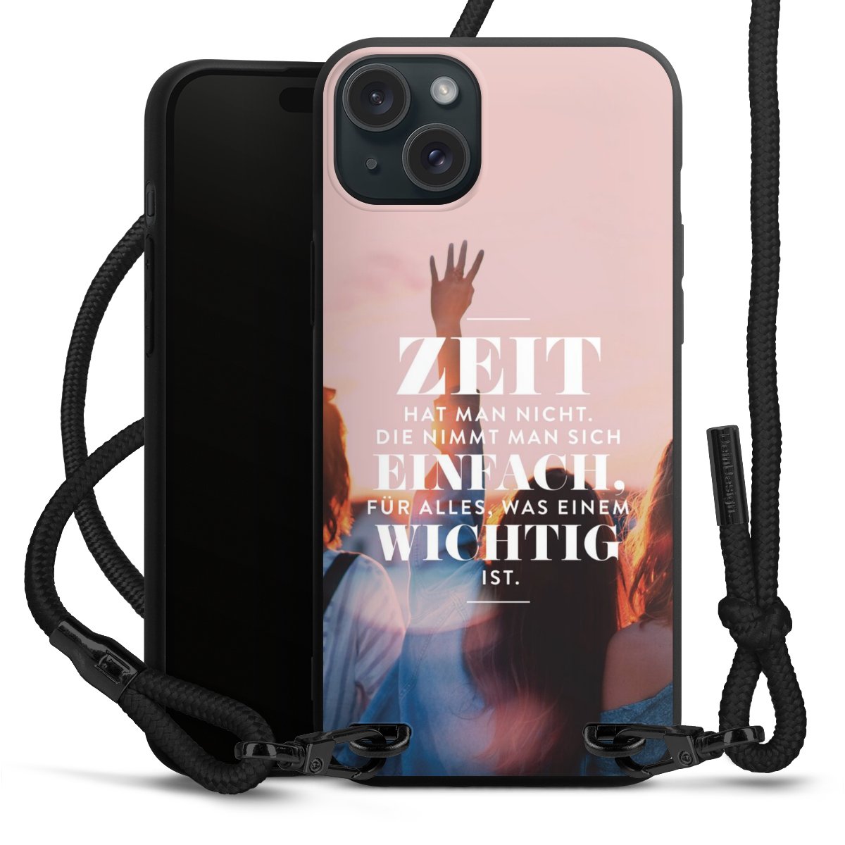 Pure Black: Handyhülle, Stoffband und Metalldetails in stylischem Mattschwarz.