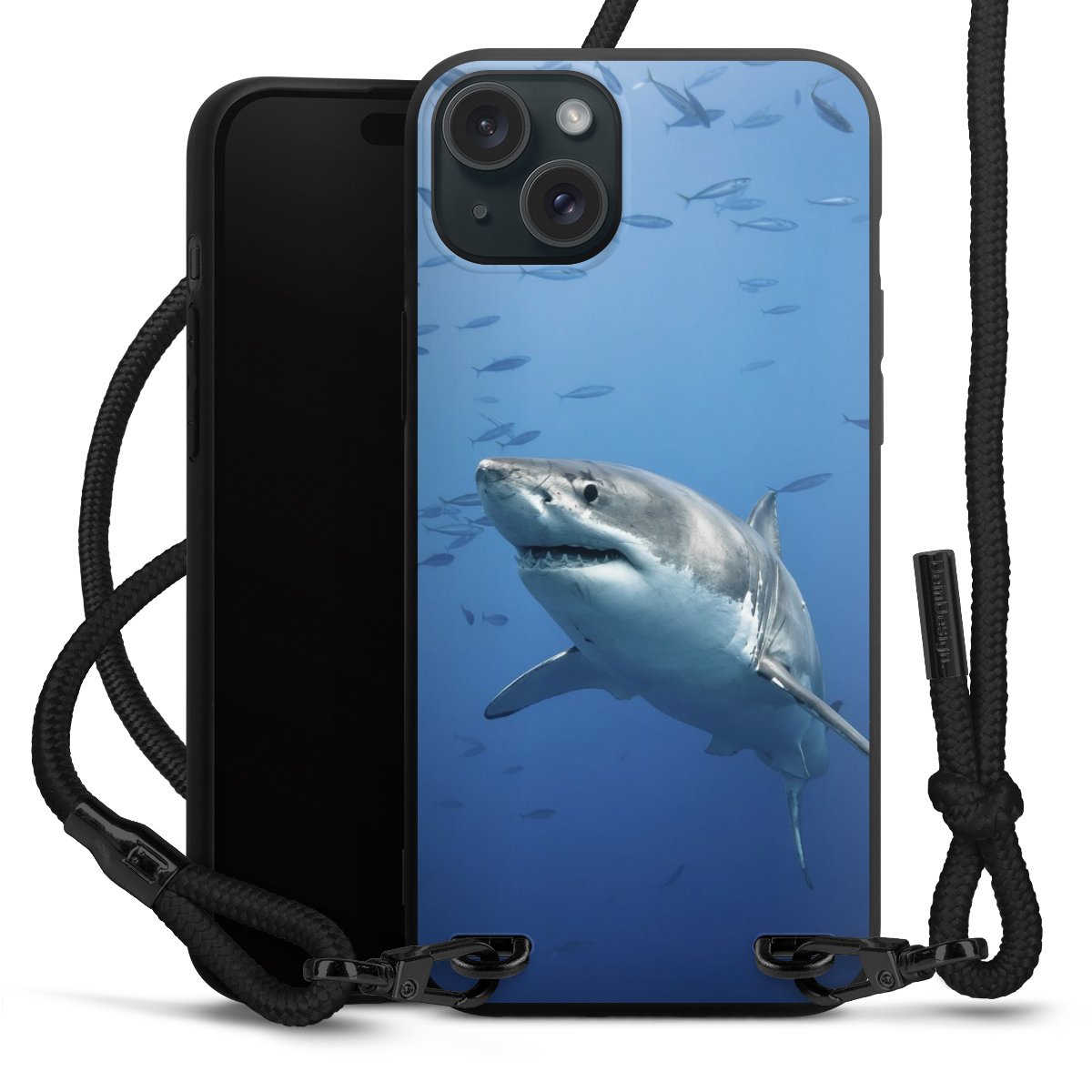 Pure Black: Handyhülle, Stoffband und Metalldetails in stylischem Mattschwarz.