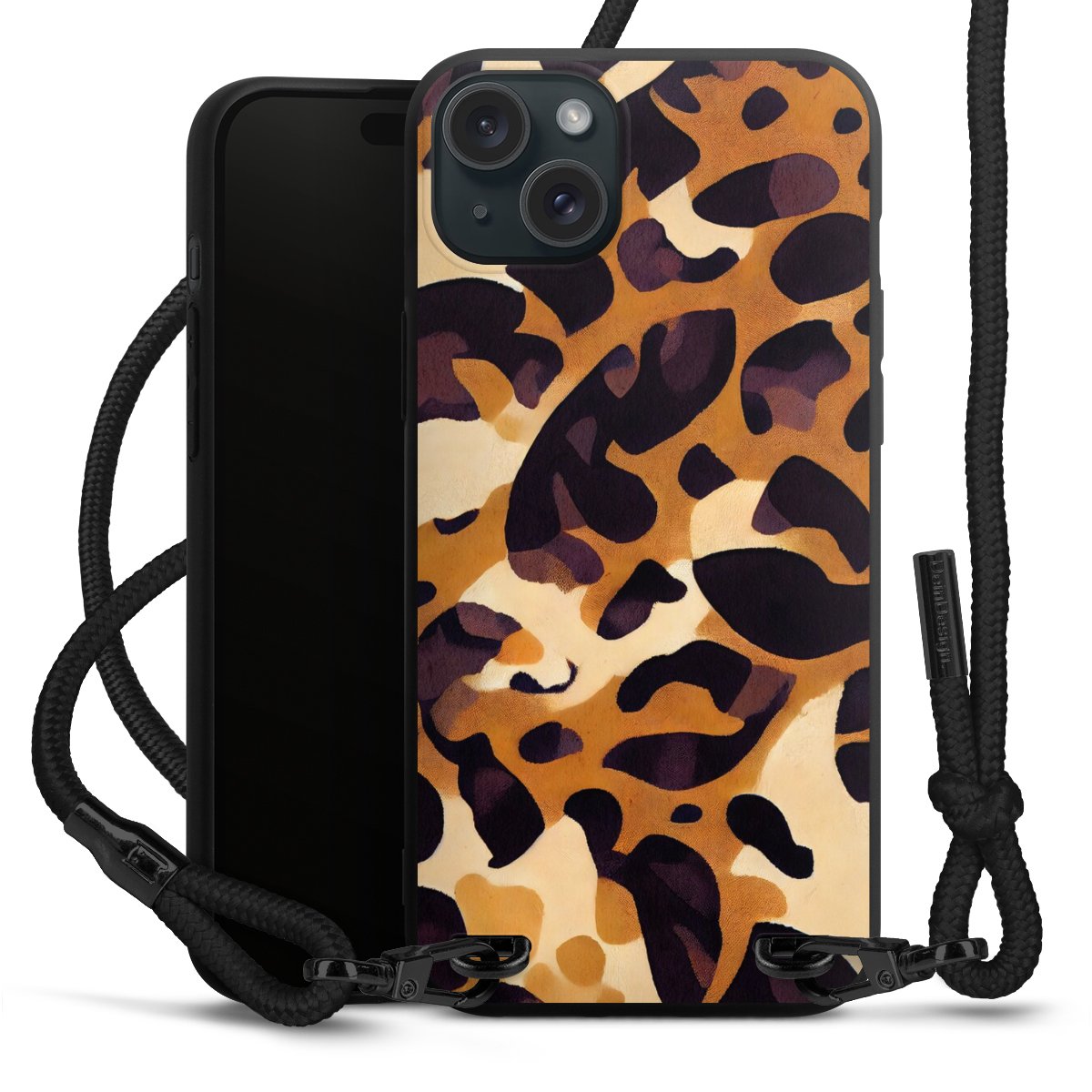 Pure Black: Handyhülle, Stoffband und Metalldetails in stylischem Mattschwarz.