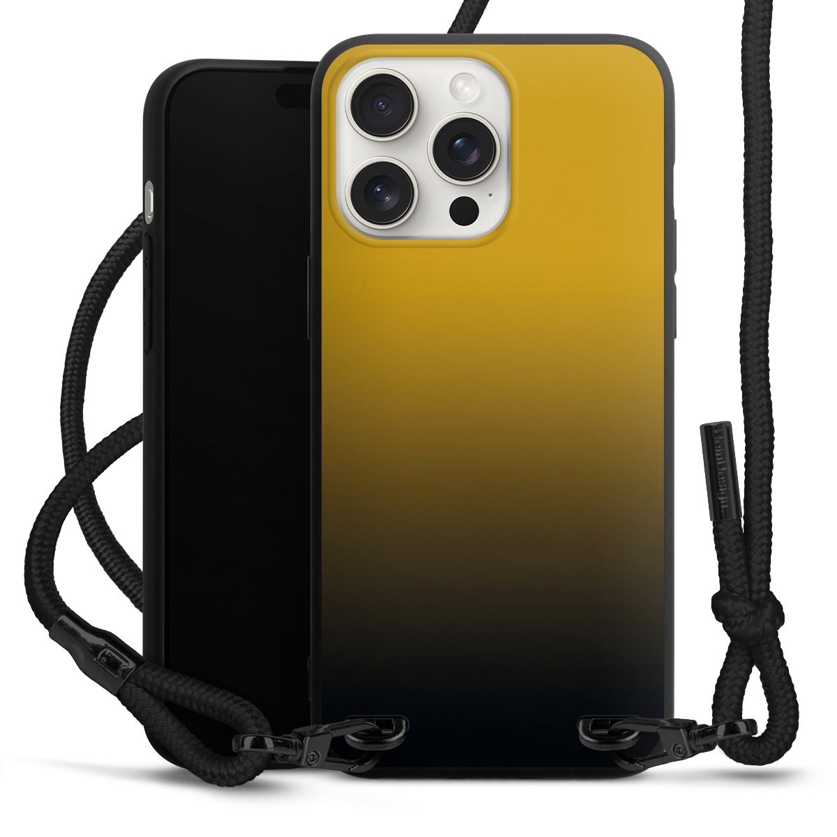 Pure Black: Handyhülle, Stoffband und Metalldetails in stylischem Mattschwarz.