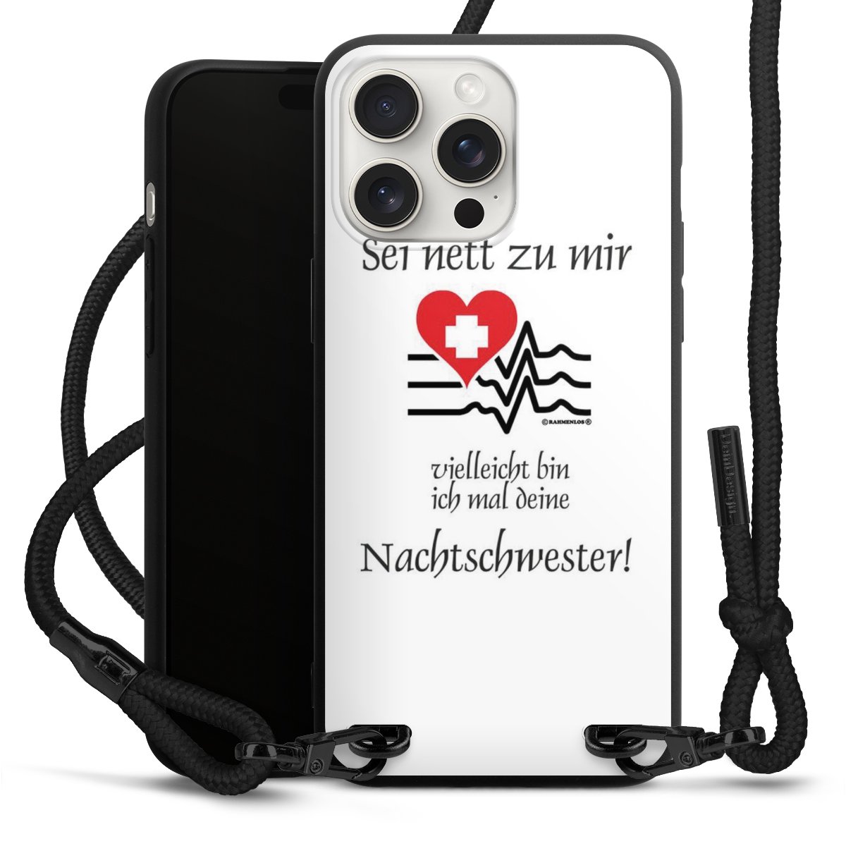 Pure Black: Handyhülle, Stoffband und Metalldetails in stylischem Mattschwarz.