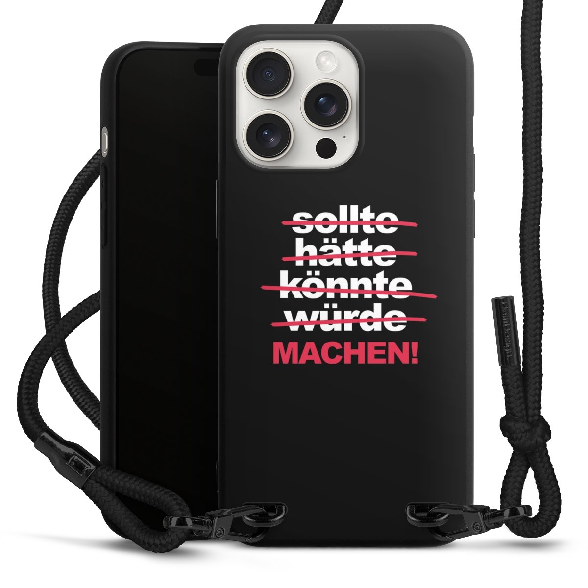 Pure Black: Handyhülle, Stoffband und Metalldetails in stylischem Mattschwarz.