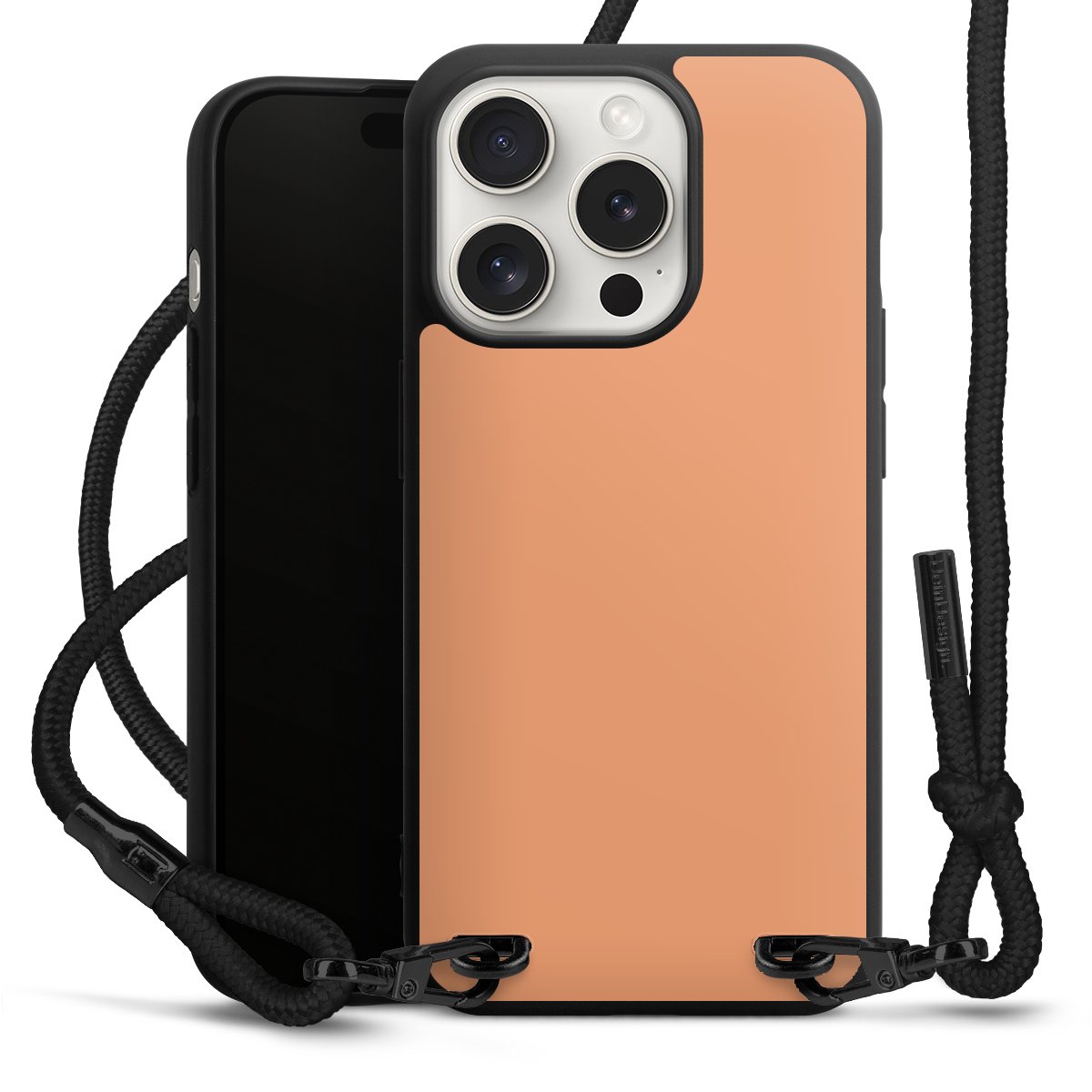 Pure Black: Handyhülle, Stoffband und Metalldetails in stylischem Mattschwarz.