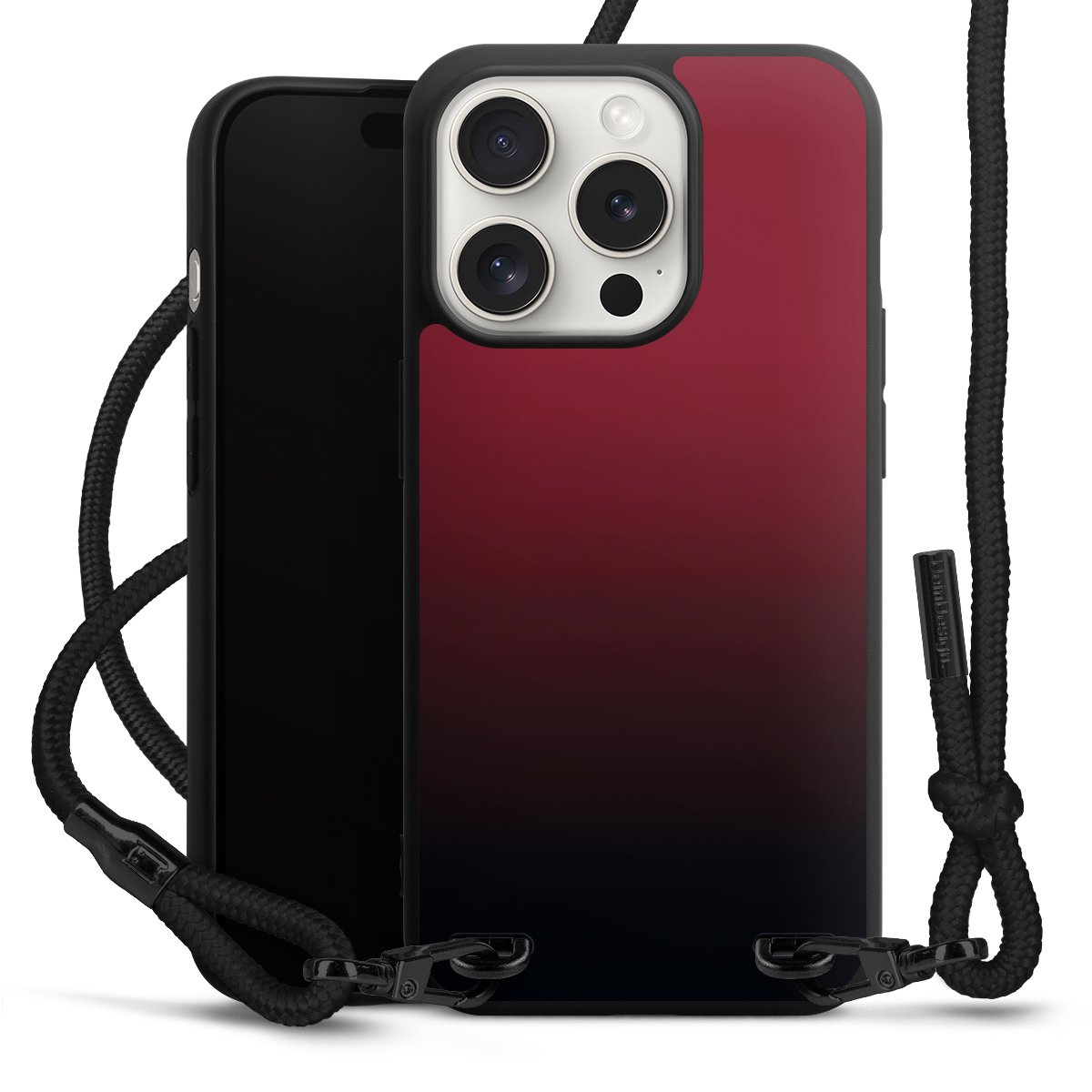 Pure Black: Handyhülle, Stoffband und Metalldetails in stylischem Mattschwarz.