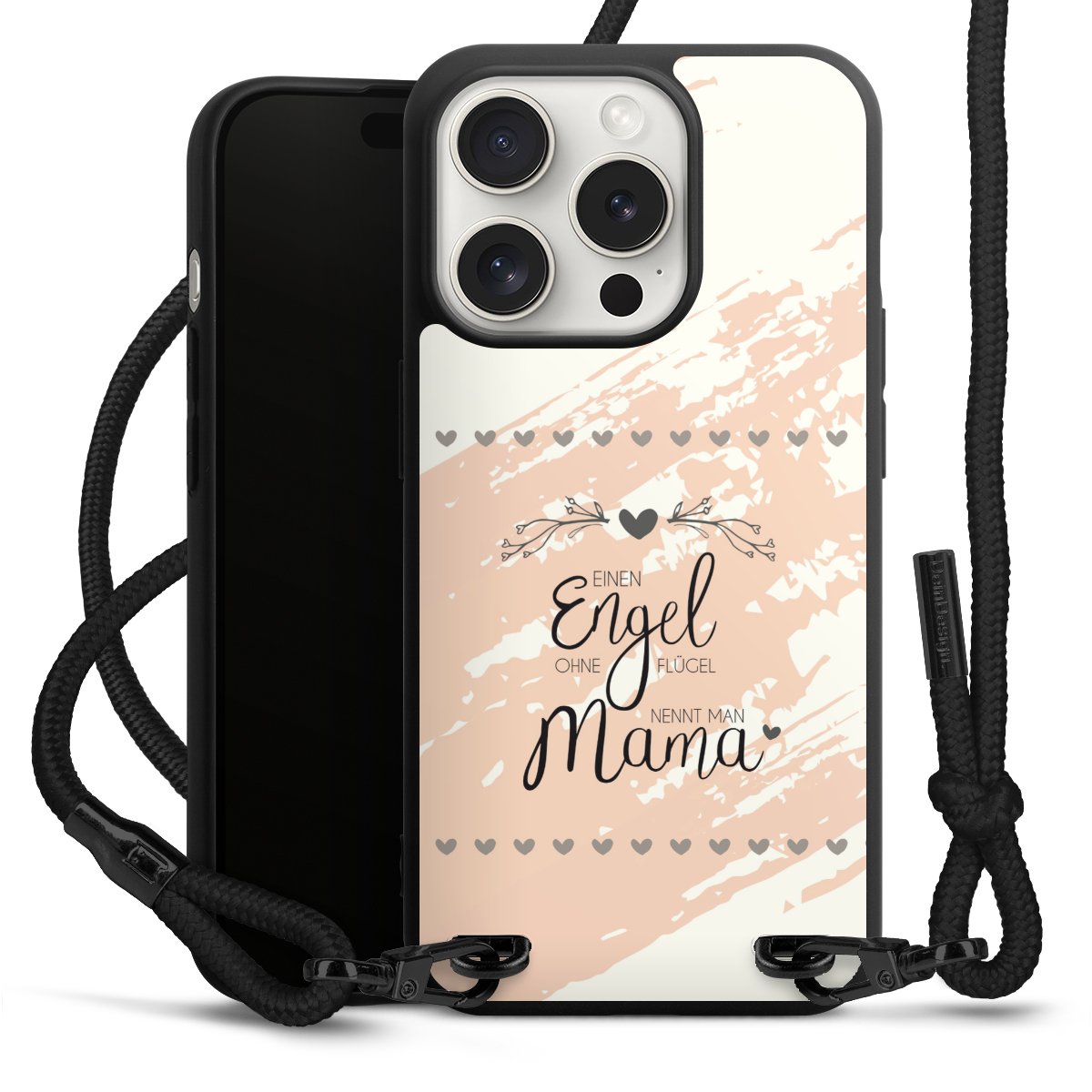 Pure Black: Handyhülle, Stoffband und Metalldetails in stylischem Mattschwarz.