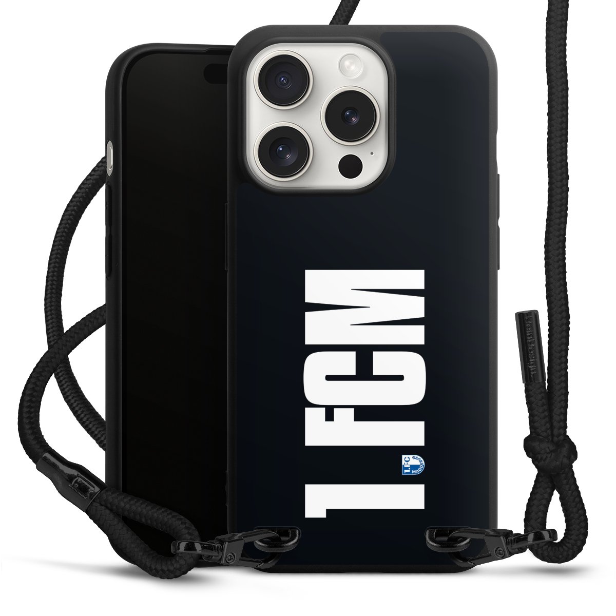 Pure Black: Handyhülle, Stoffband und Metalldetails in stylischem Mattschwarz.