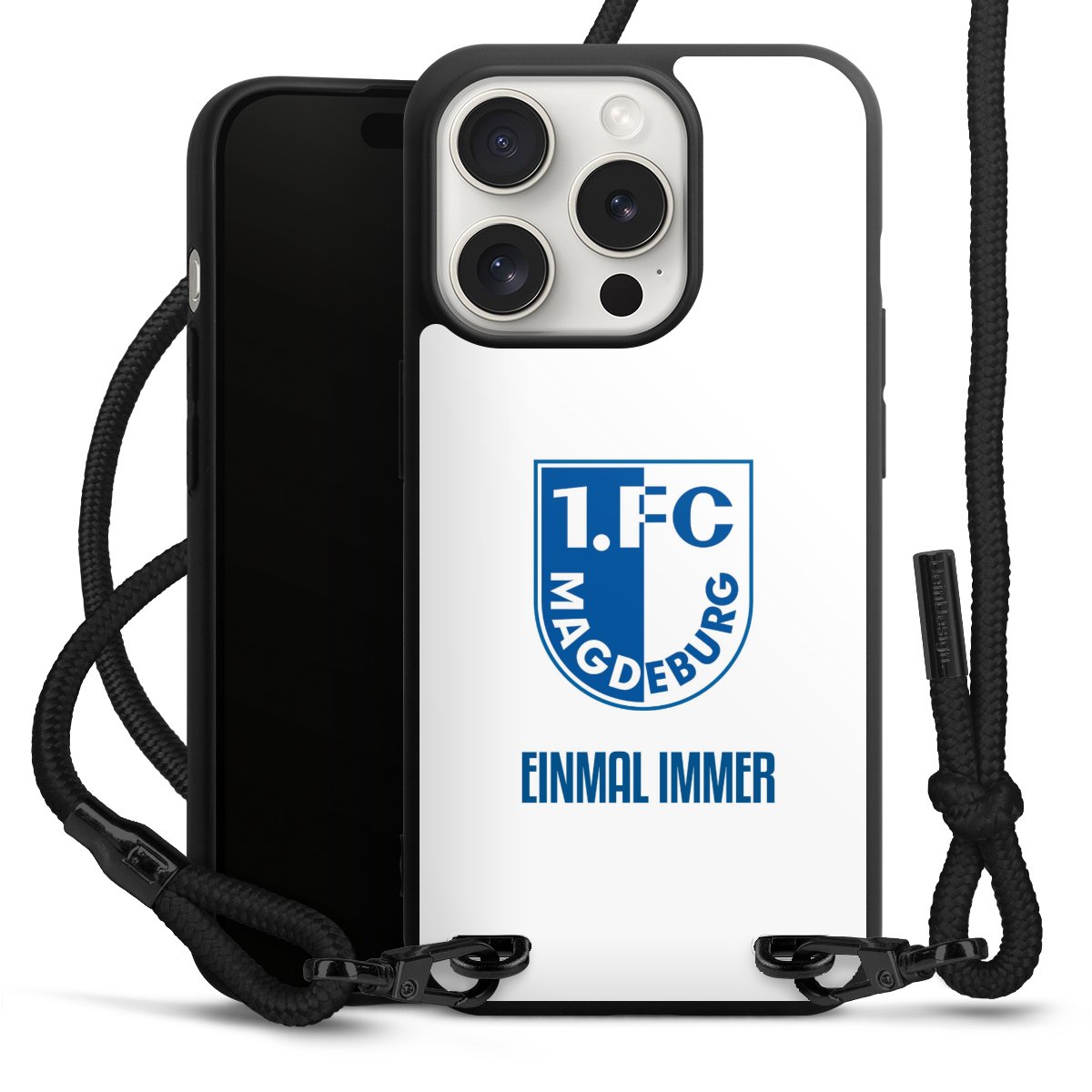 Pure Black: Handyhülle, Stoffband und Metalldetails in stylischem Mattschwarz.