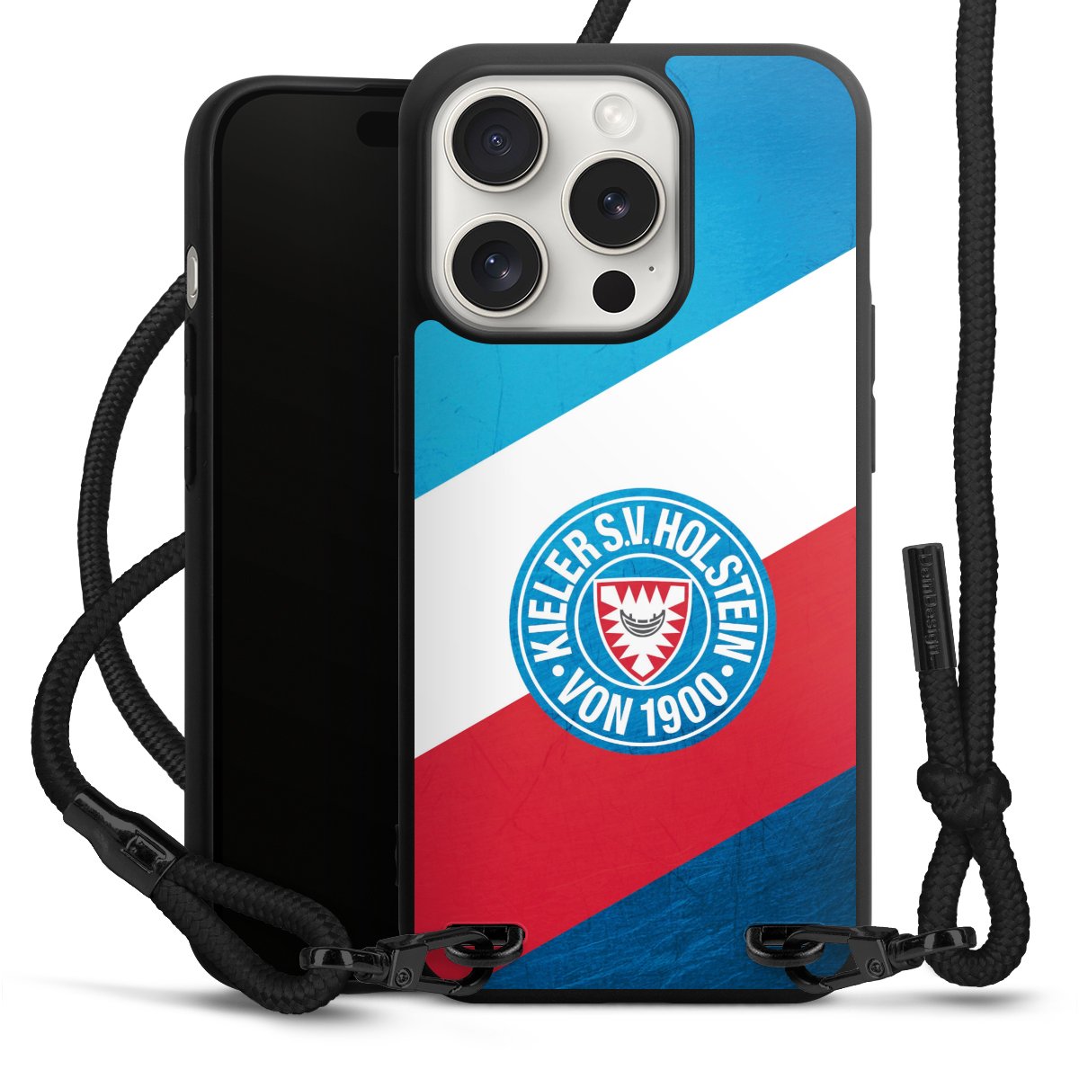 Pure Black: Handyhülle, Stoffband und Metalldetails in stylischem Mattschwarz.